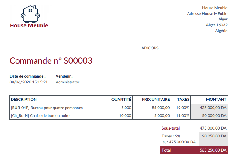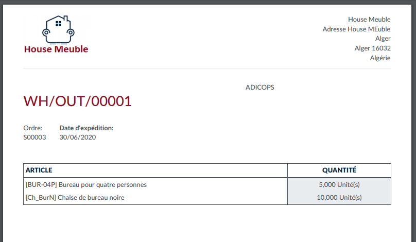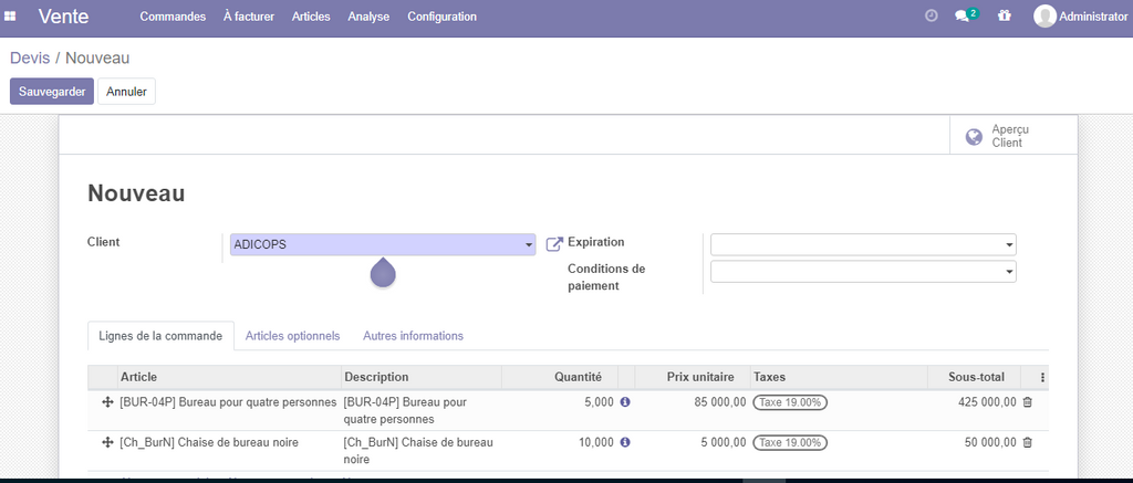 Dans notre exemple  , nous allons choisir deux article, 05  Bureaux  pour 04 personnes, et 10 chaise noir .