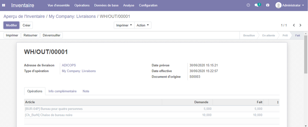 Cliquer donc sur le module Inventaire , et dans la vue qui s'affiche , rendez vous sur la partie Livraison, et cliquer sur le bouton à traiter , puis, cliquer sur la ligne de notre commande en cours .