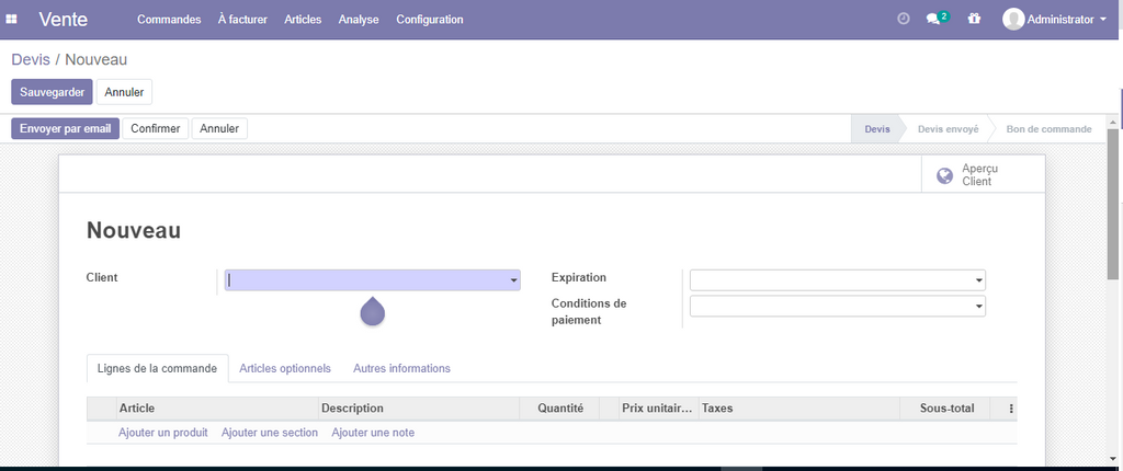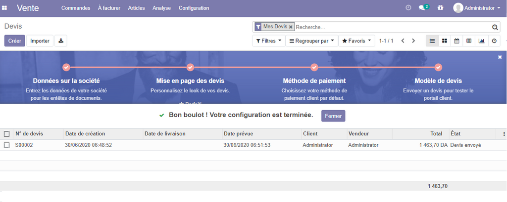 Création des devis client  : Lorsqu'on clique sur le menu vente de notre plateforme, odoo nous mènera directement vers la partie gestion des devis clients . vous pouvez remarquer le devis de test créé précédemment lors  de notre configuration des donnée de  l’entreprise .
