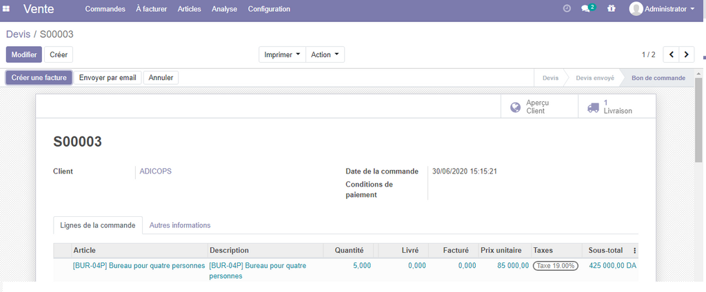 En validant la commande vous remarquer la création d'un nouveau bouton qui est crée une facture.