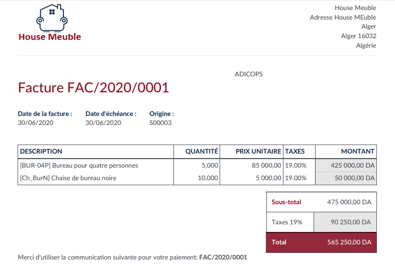 Après la validation de votre facture , un numéro séquentiel automatique, de votre facture sera créé comme dans notre exemple, (FAC/2020/001) pour identifier vos factures , et elle sera affiché dans la partie comptabilité.