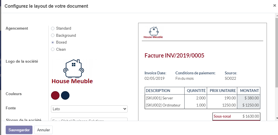 Dans notre exemple, nous avons choisi le layout boxed, il est possible également d'introduire d'autres informations sur le pied de page, tel que le slogan,  le type de papier , etc.