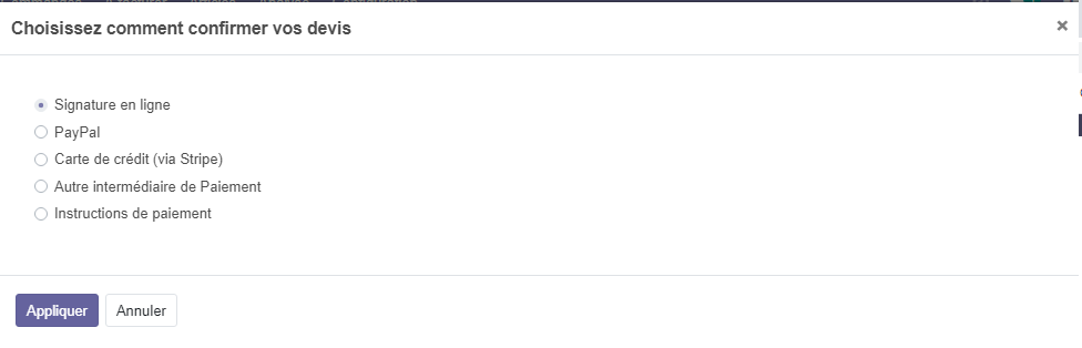Méthode paiement   :  ce bouton,  vous permettra de choisir comment confirmer vos commandes , on va laisser cette option comme proposé par odoo