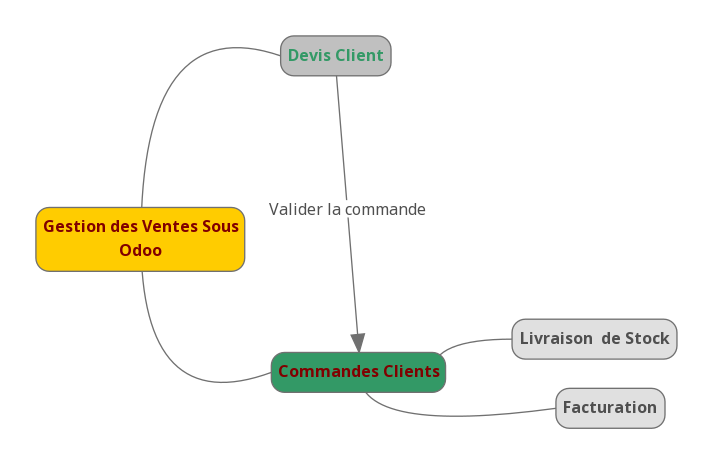 Avec Odoo , le cycle de vente, est optimisé et simplifié .  on  commence  par l’élaboration du devis au client à travers  un simple formulaire, qui va contenir les détailles du devis et les produits à inclure . une fois le client valide la commande, on clique sur un simple bouton , la commande est lancée, et deux actions seront déclenchées, la livraison du stock au client et la facturation.