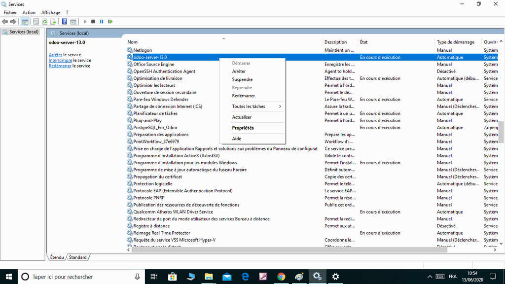 une fenêtre s'affiche vous montrant la liste des services avec leurs états . vérifier si le service odoo13 est bien en exécution ou le redémarrer manuellement en cliquant sur le bouton droit de la souris puis sur redémarrer