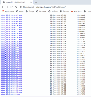 Par la suite, rendez vous sur le site officiel de téléchargement des versions odoo 13 (la dernière version),  en suivant le lien http://nightly.odoo.com/.