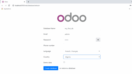 Odoo s'exécute sur un navigateur web sur le port 8069 par défaut , pour le lancer il faut taper l'adresse du serveur suivi par : 8069 , dans notre cas l'installation est en local, il suffit donc de taper : localhost:8069, odoo se lance pour créer la première base de données qui contiendra les futurs applications .