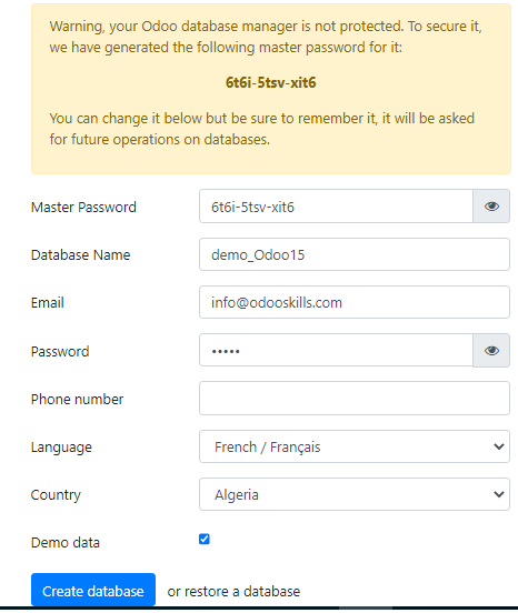 ·         Database name : mettez le nom de la base de données exemple demo_odoo15