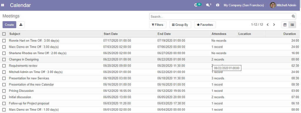 Comme montré dans Dans l'exemple ci-dessus issu d'une version démo, Vous pouvez consulter votre calendrier ainsi que les calendriers des autres employés, ou participants , par jour, semaine ou par mois .