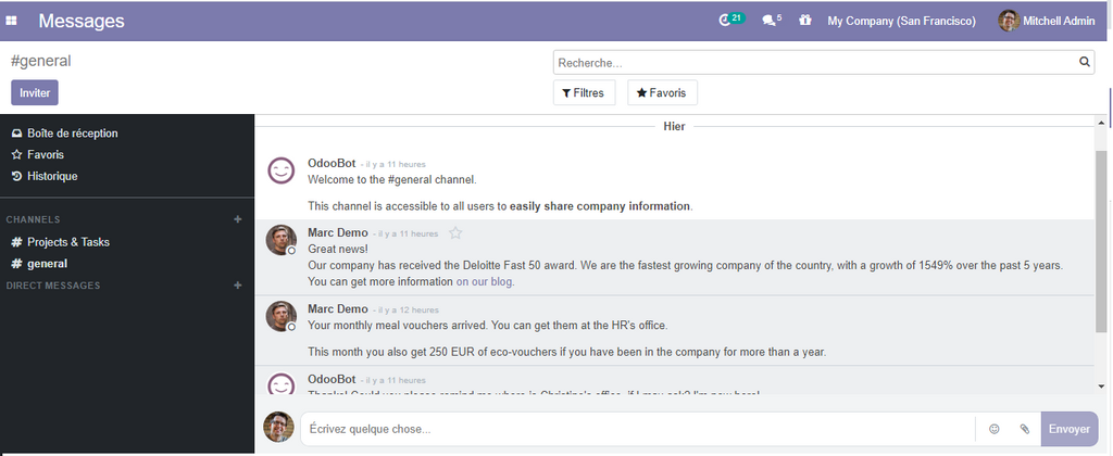 Comme mentionné précédemment l'application Messages est une application de base qui s'installe automatiquement avec la première application ou module . Son rôle est de permettre la communication et l'échange entre les différents utilisateurs de l'entreprise .