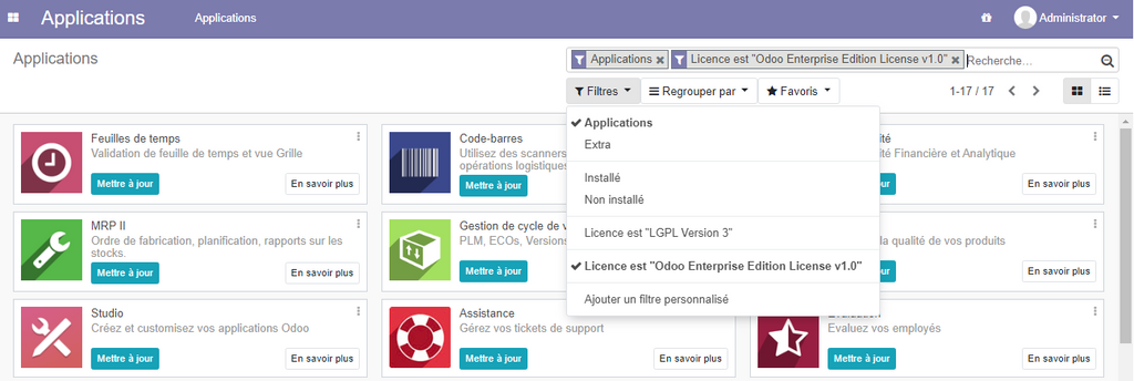 Dans notre cas , vous pouvez remarque dans la liste des applications , on trouve soit le bouton installer, qui représente la version communautaire soit le bouton mettre à jour , qui nécessite un achat de licence . une astuce simple , pour n'afficher que les applications libres est de filtrer dans la barre de recherche présente à droite la version libre ; pour ce faire cliquer sur filtrer , puis ajouter un filtre personnalisé puis licence et choisir Licence LGPL 3 :