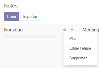 Les colonnes Nouveau, Meetings minutes , Notes et à Faire Sont des étapes proposées par défaut par odoo, mais vous pouvez les personnaliser en cliquant en haut sur l'icone de configuration puis éditer l'étape en cours.