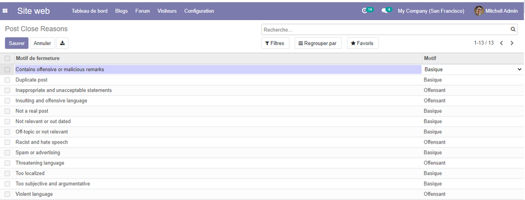Par défaut, Odoo donne des droits de 1 à 1000 Points récoltés. 1 vous permet de modifier ses question et 1000 vous donne la possibilité de modérer les messages.