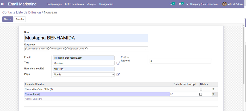 Vous pouvez créer manuellement des nouveaux contacts, en cliquant sur le bouton Créer, puis dans la fenêtre qui s’affiche, vous pouvez introduire les informations nécessaires, comme le nom, la liste de diffusion, les étiquette, la société, …