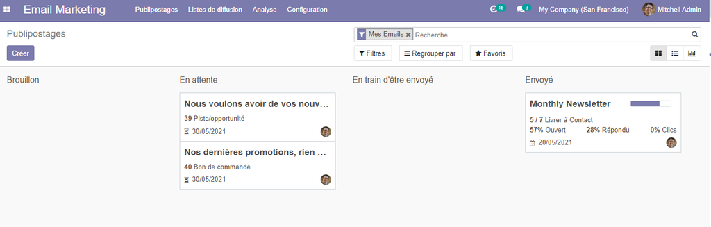 - En enregistrant votre publipostage, il sera mis automatiquement en état brouillon, vous pouvez le visualiser dans la vue Kanban.