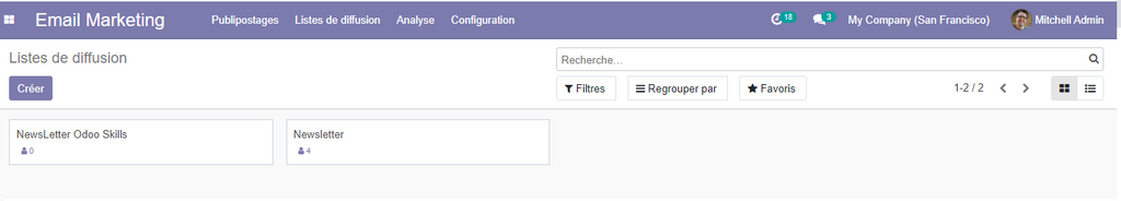 Par défaut, et puisque nous avons téléchargé des données de démonstrations, vous trouvez déjà une liste créée avec quelques utilisateurs qui sont membre à cette liste.