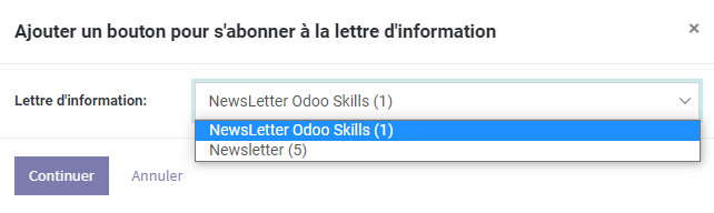 Le widget block permet d’insérer un bloque sur la page et qui porte un champ email à insérer par l’utilisateur et un bouton s’inscrire, à ce niveau on peut préconfigurer la liste sur laquelle va s’inscrire le visiteur du site, dans notre cas nous avons deux liste (newsletter Odooskills, Newsletter,..), mais on peut avoir plusieurs listes.