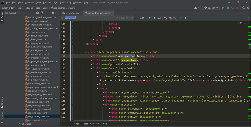 Vous pouvez trouver toutes les vues relatives aux modèles de base d’Odoo sur le répertoire /views .