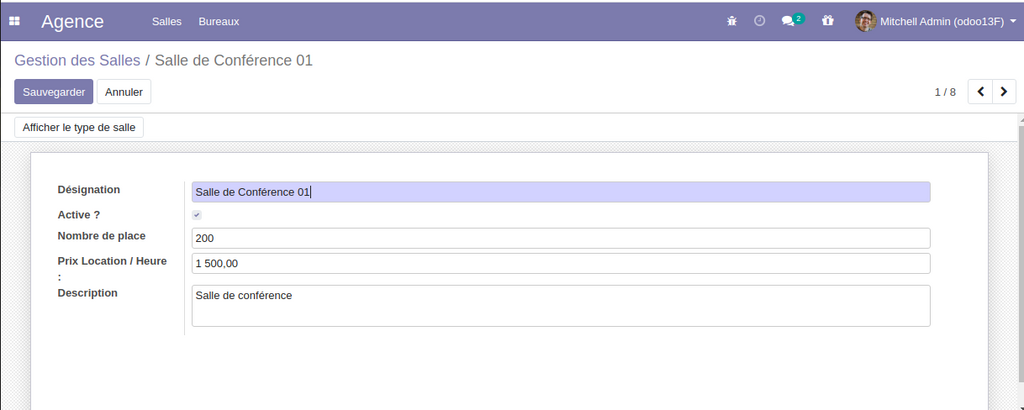 Pour visualise les changements, Vous devez redémarrer le serveur parce que nous avons fait un changement au niveau du fichier python (__manifest__.py) , et mettre à jour de l'application , puisque nous avons ajouté une nouvelle vue , qui est stocké dans un fichier xml (agence_views.xml) , on obtiendra les formulaires salles et bureaux plus élaborés .
