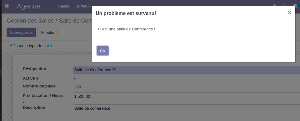 Dans note exemple, on va utiliser un exemple qui permet de comprendre le principe générale, Lorsqu'on clique sur le bouton vérifier le type de la salle l'application nous renvoie un message nous indiquant que la sale est une salle de conférence ou autres.