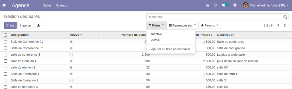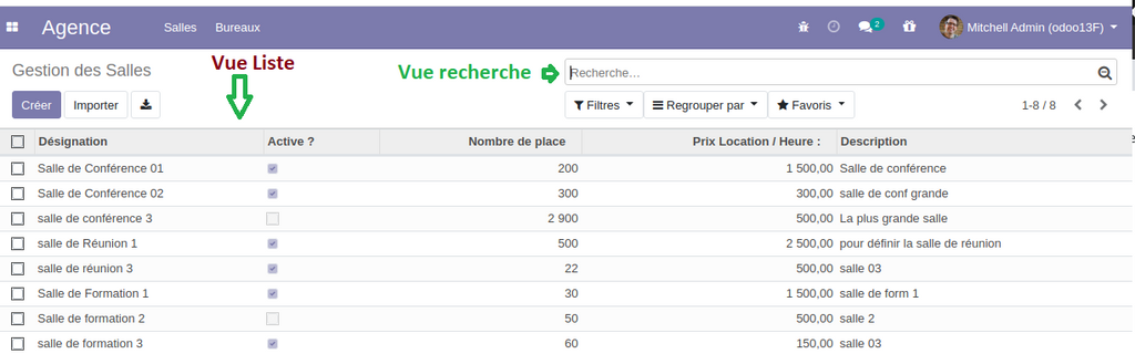 Pour le filtrage , on définit un filtrage sur les salles/Bureaux actives ou nous active . Pour définir la vue relative, à un modèle donné, nous ajoutons dans notre fichier xml, agence_views , le code suivant :