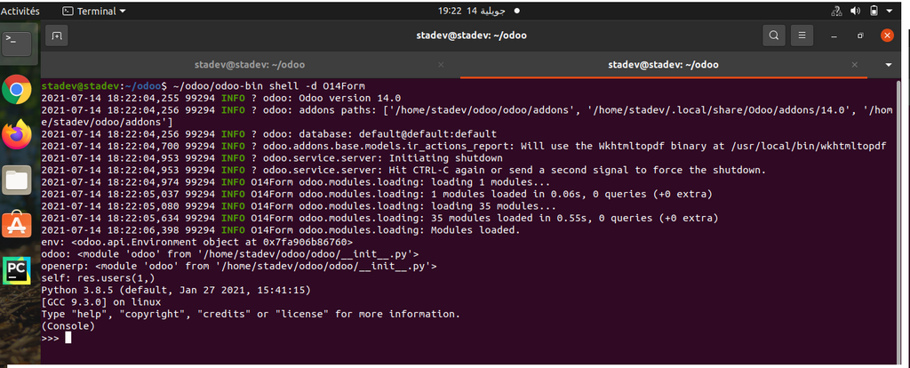 Rappel : pour accéder au terminal python d’Odoo exécutez la commande suivante sur le shell d’Ubuntu (Vous pouvez consulter l’article précédent pour plus de détailles).