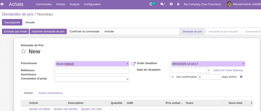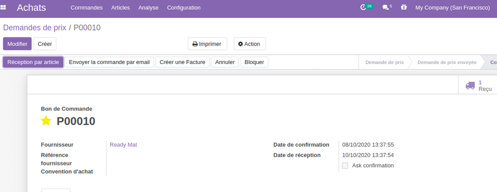 Encore pour s’assurer de l’arrivé de la commande fournisseur , nous pouvons demander au fournisseur de Confirmer la date d’envoie de la commande , avec une notification de la date , en envoyant un email contenant les produits de la commande, et pour chaque produit le fournisseur peut définir la date de livraison prévue.