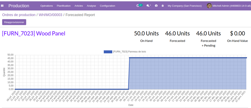 Dans la partie gestion de production, il est désormais possible de gérer les quantité des produits dans l’ordre de fabrication, à travers la possibilité de prévision des quantité en visualisant le diagramme de prévision de disponibilité , avec souplesse de modification dans l’OF si vous voulez ajouter d’autres composants