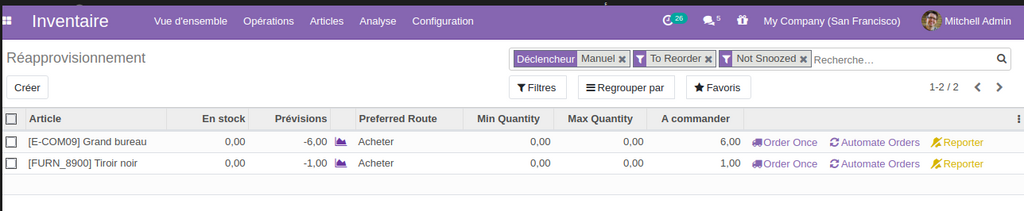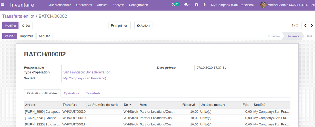 Dans la partie inventaire, et afin d’être plus pratique et plus rapide, il est maintenant possible de regrouper plusieurs bons de livraisons en un seul lot de transfert ou batch, puis les faire livrer au partenaire à la fois.