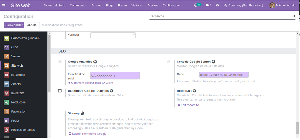 Il est maintenant possible d’ajouter votre sitemap à google, et de faire les configurations nécessaires pour optimiser le référencement de votre site web sur internet, depuis la partie configuration de site web.
