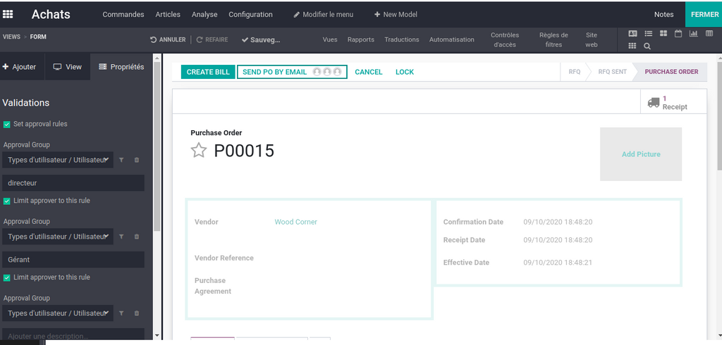Iil est désormais possible de personnaliser le workflow selon les règles de votre entreprise ( les étapes de validations ou Approvals en Anglais) . par exemple lorsque le montant de la commande fournisseur est important ( supérieur à 5000 $ par exemple) , il faut ajouter d’autres étapes qui sont la signature du directeur d’approvisionnement + la signature du DG par exemple .