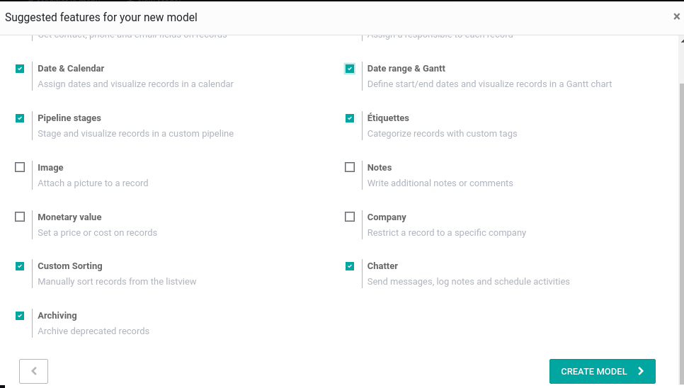 Lors de création du modèle, une fenêtre s’affiche pour vous proposer des champs prédéfini que vous pouvez les ajouter directement , ce qui permet de gagner plus de temps