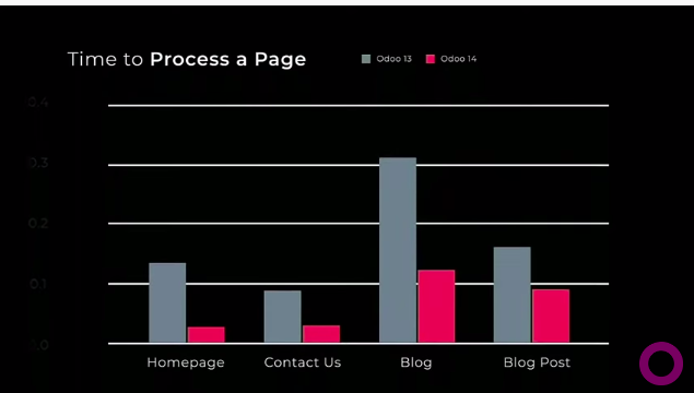 Odoo 14 , le temps moyen de chargement d’une page 3.42 plus rapide que la version, odoo 13, et les tableaux de type pivot, utilisé principalement pour la partie BI (Business Intelligence), sont 40 fois plus rapide qu’ Odoo 13, à cause de l'utilisation d’owl (Odoo Web Library ) .
