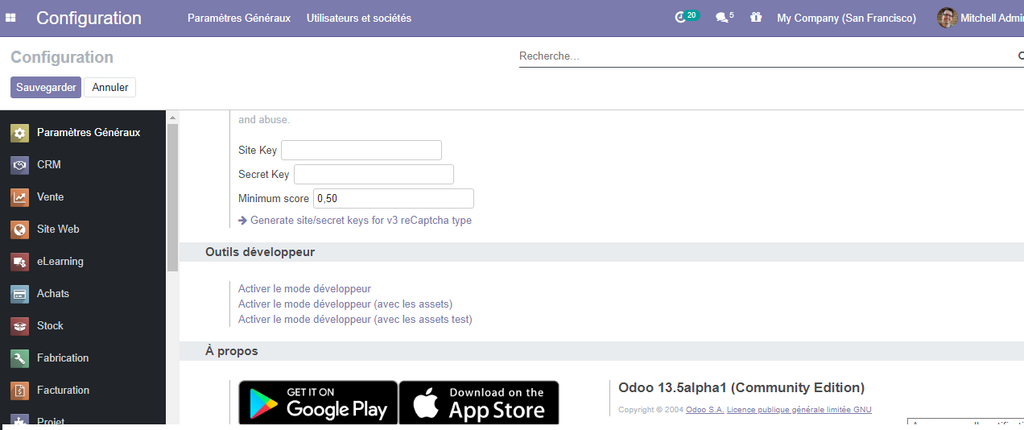 A Présent , vous avez activer la puissance cachée d'odoo ! et vous avez accès au mode développement, et plusieurs fonctionnalités sont activées .